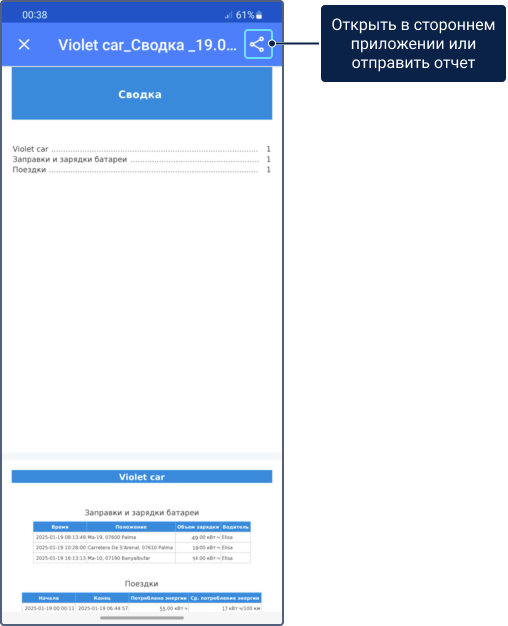 Результат: Выполненный отчет представляет собой файл PDF. Он включает в себя имя объекта, содержание и таблицы отчета. Вы можете поделиться этим файлом или открыть в другом приложении, нажав на иконку