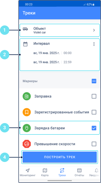 Просмотр зарядок на треке объекта
