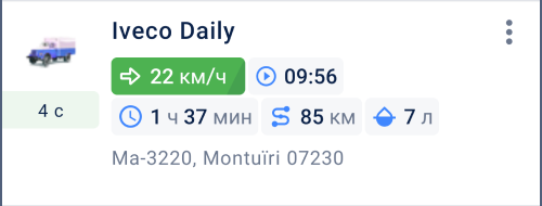На вкладке Мониторинг в карточках объектов показываются последние данные об объектах: скорость, длительность поездки или стоянки, уровень топлива, значения датчиков, местоположение и др. Эта информация доступна в рабочем списке и подробной информации.
