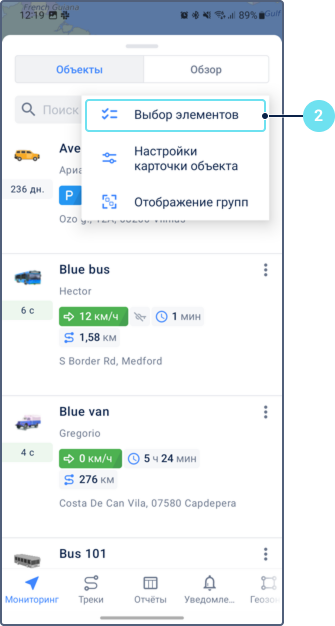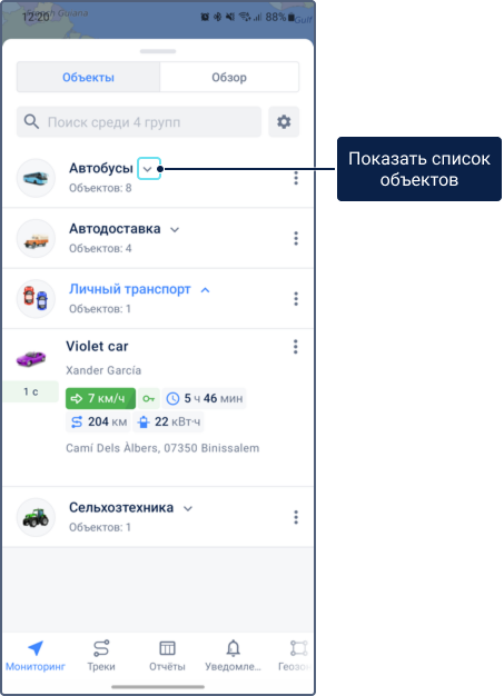 В режиме просмотра объектов показываются карточки отдельных объектов. Они содержат последние известные данные объекта и меню управления объектом, позволяющее отправлять команды, делиться местоположением, строить отчеты и треки и выполнять другие действия.