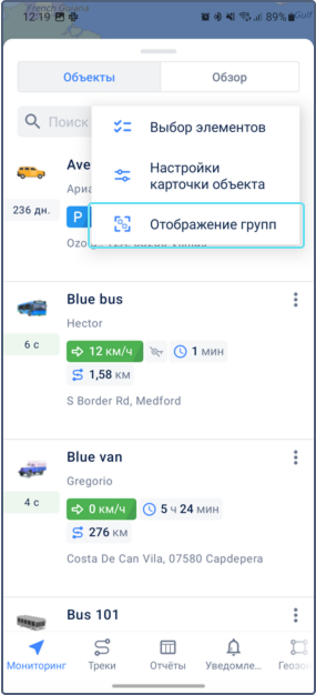 В режиме просмотра групп показываются имена групп и количество входящих в них объектов. Чтобы развернуть список объектов, входящих в группу, нажмите на строку с ней. Также доступно меню для выполнения действий с группой объектов.
