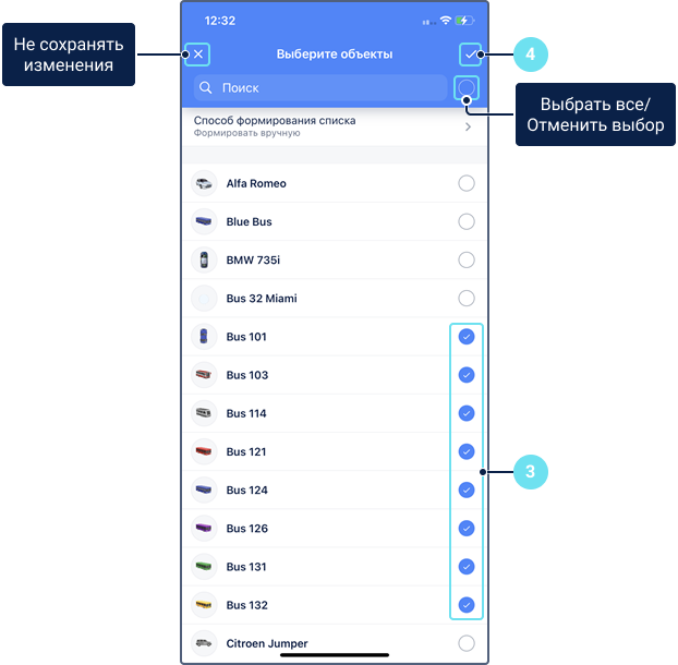 Синхронизировать с веб-версией Показываются те же объекты и группы, что и в рабочем списке на вкладке Мониторинг веб-версии. Если опция включена, редактировать список вручную невозможно. Формировать вручную Вы самостоятельно добавляете объекты, которые должны показываться в списке. -