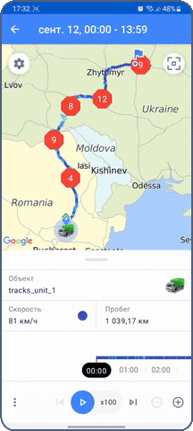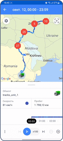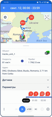 Во время проигрывания иконка объекта перемещается по треку. При этом в информационном блоке под картой меняются значения датчиков, параметров, скорости и адрес объекта.