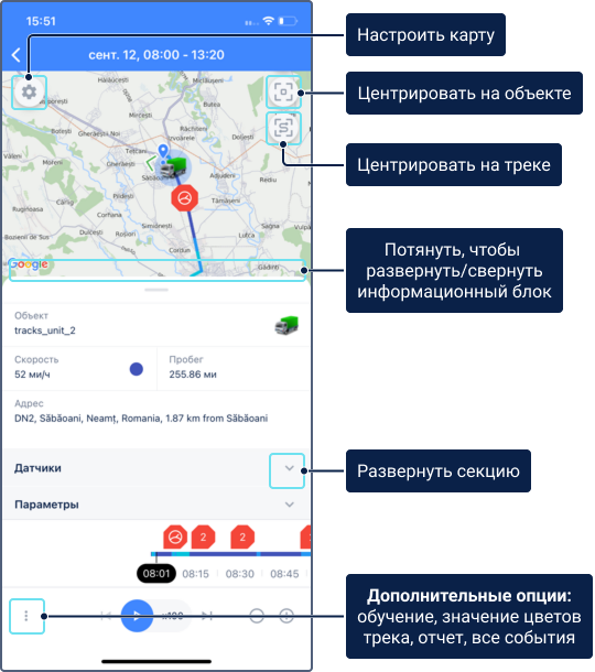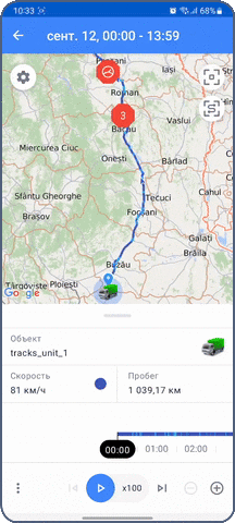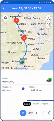 Вы можете передвигаться по треку, чтобы видеть, где находился объект в определенный момент времени и как менялись значения скорости, параметров и датчиков.