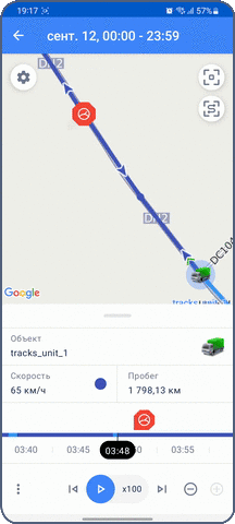 Вы можете перейти к определенным точкам трека, чтобы увидеть точное местонахождение объекта, значения скорости, параметров и датчиков в определенный момент времени.