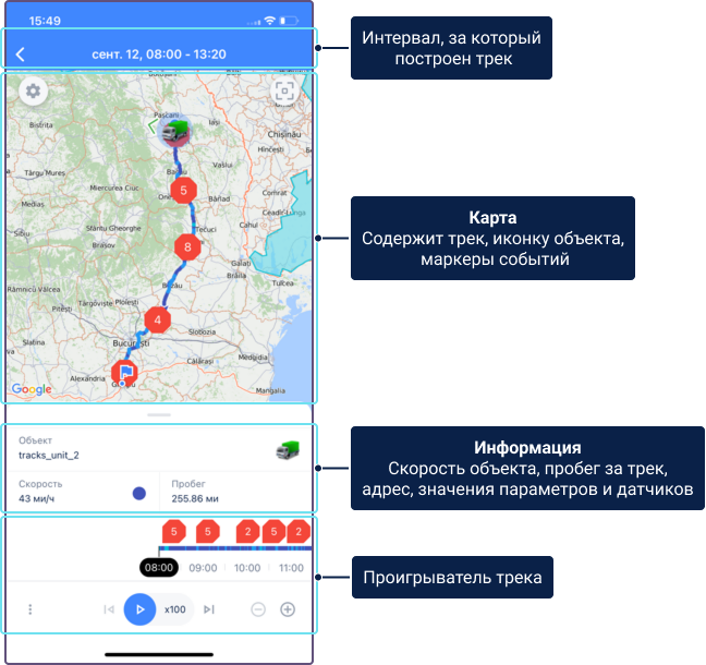 - карта, на которой показаны трек, иконка объекта, маркеры начала и конца трека и маркеры событий;