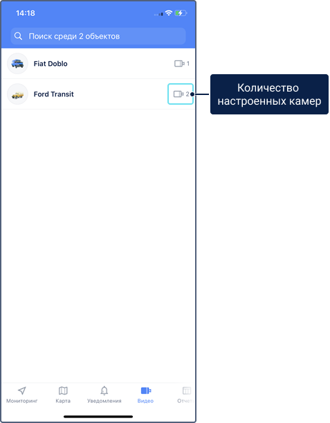 Вкладка представляет собой список объектов, для которых настроены камеры. Камеры можно настроить в системе мониторинга на вкладке Видео свойств объекта или в мобильном приложении в настройках камер на вкладках Трансляция или Запись. Напротив имени каждого объекта показывается иконка