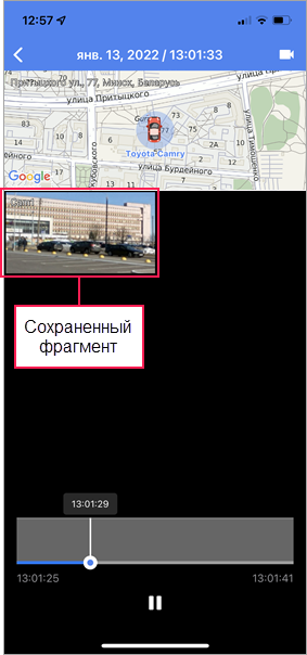 Сохраненный видеофрагмент показывается под блоком с картой. Двойное нажатие на блок с видеофрагментом позволяет открыть его во весь экран.