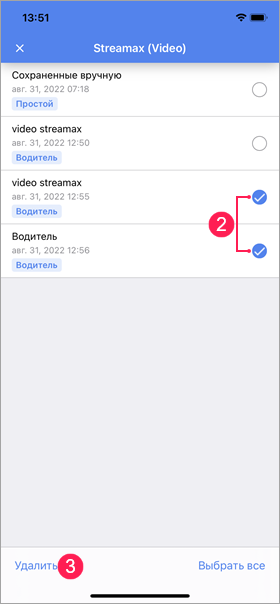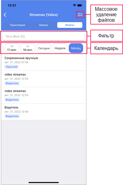 В списке содержатся все сохраненные файлы объекта. Если файл сохранен в результате срабатывания уведомления, он называется именем этого уведомления. Если файлы сохранены вручную, они называются Сохраненные вручную. Файлы отсортированы по дате и времени события. Под датой и временем показывается тег типа события (если указан).