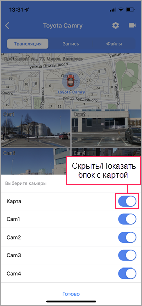 в правом верхнем углу экрана, с помощью переключателя включите или отключите необходимые камеры и нажмите на Готово.