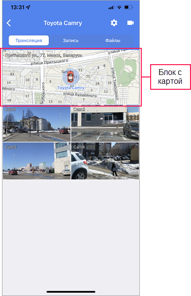 В верхней части экрана показывается блок с картой, которая центрируется на местоположении объекта. В левом верхнем углу блока показывается адрес, по которому объект находится в настоящий момент. Местоположение объекта обозначается его иконкой.