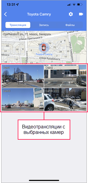 На этой вкладке можно смотреть видео с камер объекта в режиме реального времени, следить за его передвижением на карте и настраивать камеры.