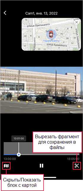 Необходимый фрагмент записи можно сохранить как файл, который впоследствии становится доступным на вкладке Файлы. Сохраненные файлы также доступны в веб-версии Wialon на одноименной вкладке, в сообщениях и отчетах.