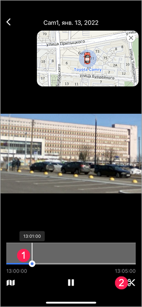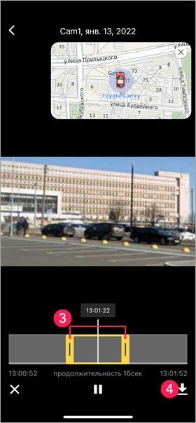 С помощью ползунков слева и справа установите продолжительность до и после события в секундах. Минимальная допустимая продолжительность — 2 секунды, максимальная — 60 секунд. Продолжительность сохраняемого фрагмента равняется сумме секунд до и после события (положения белого ползунка) и показывается под временнóй шкалой.