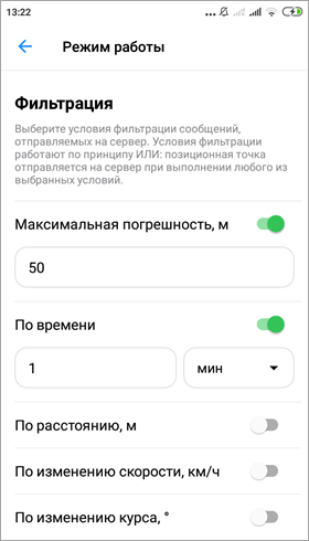 Сообщения фильтруются только в том случае, если они получены посредством GPS. Если местоположение определяется по сотовым вышкам и Wi-Fi, сообщения имеют нулевые значения скорости, курса, количества спутников, а погрешность может превышать 2000 метров, поэтому они фильтрации не подвергаются.