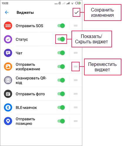 Телефон экстренной связи | Настройка доступна для виджета Отправить SOS. В этом поле можно указать номер телефона, на который должен осуществляться вызов при отправке тревожного сообщения. |