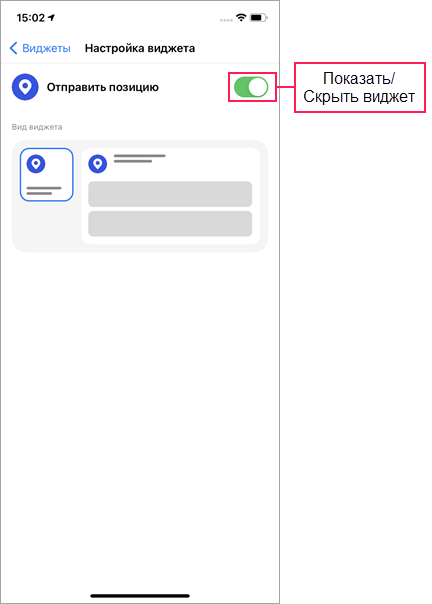 Чтобы перейти к настройкам определенного виджета, нажмите на строку с ним. Здесь можно скрыть виджет с помощью переключателя или изменить его вид, выбрав необходимый вариант в блоке Вид виджета.